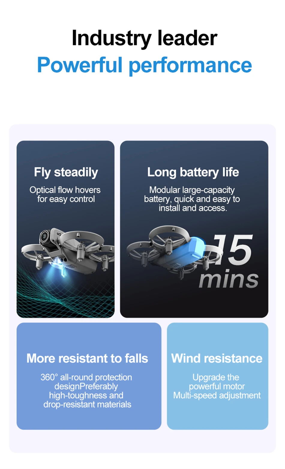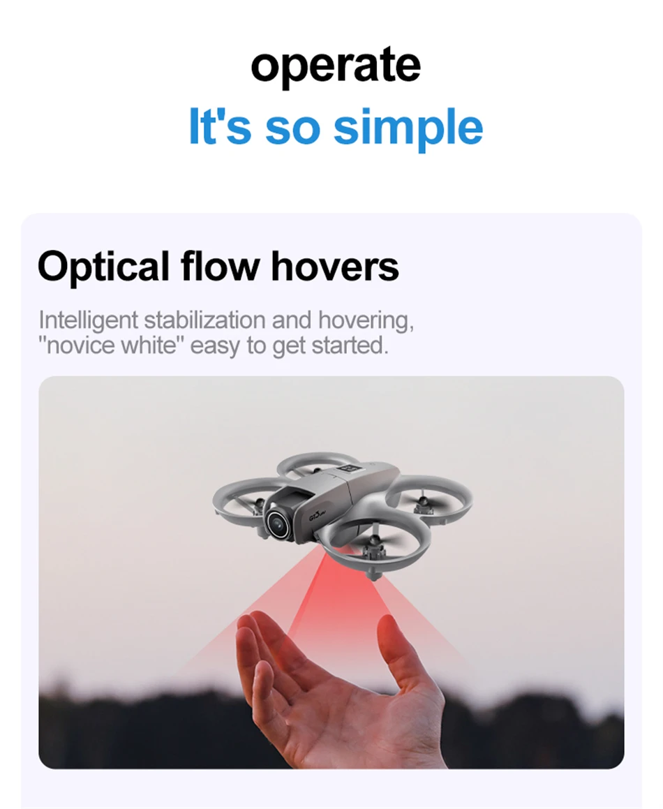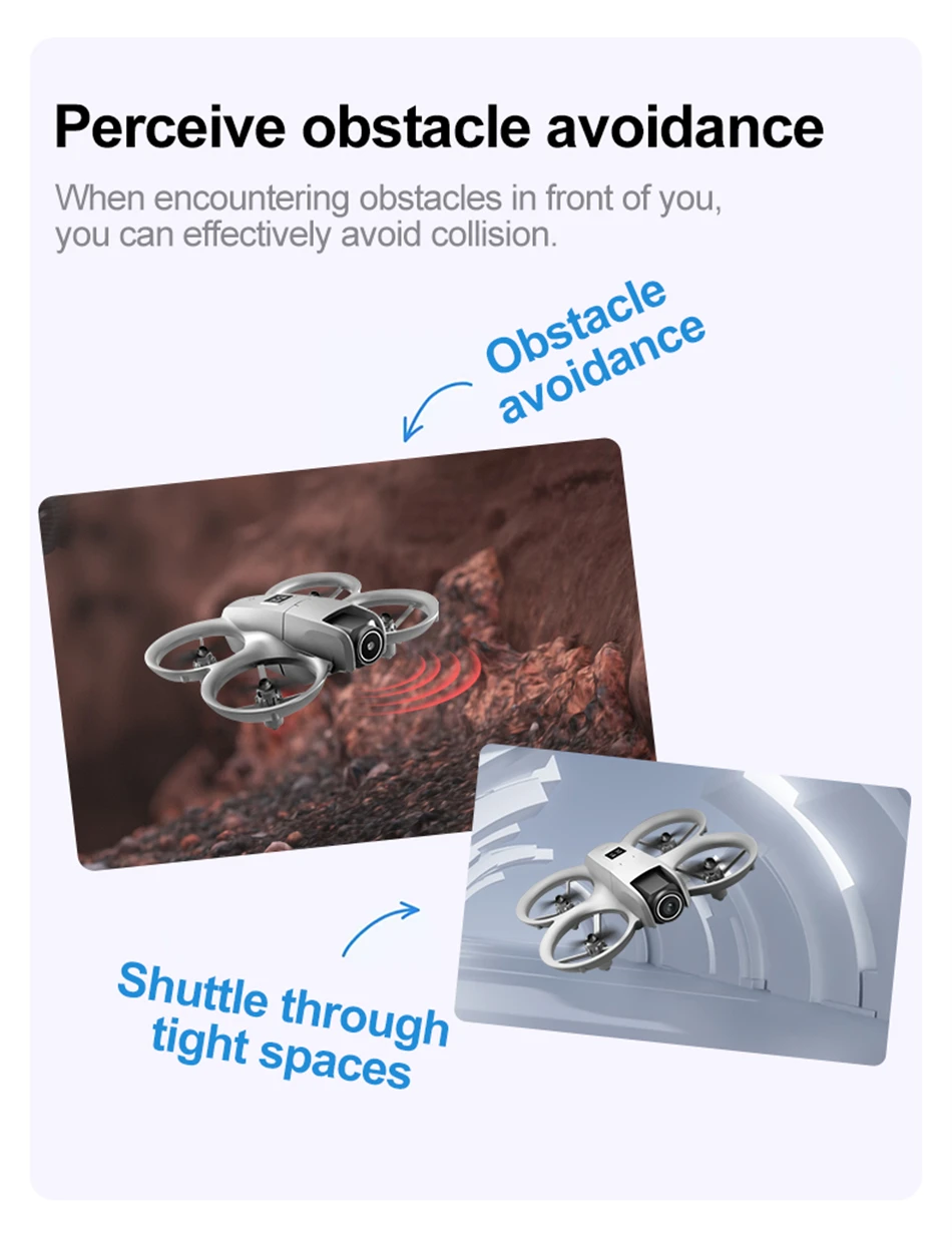2: The drone has a fixed altitude maintenance mode function, built-in three sided sensing obstacle avoidance, electrically adjustable lens, and can achieve 180 ° upward shooting, optical flow fixed-point positioning, and stable flight.
