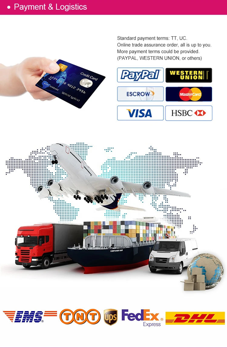 A: Paypal, T/T, Western Union,Alibaba at sight are available.