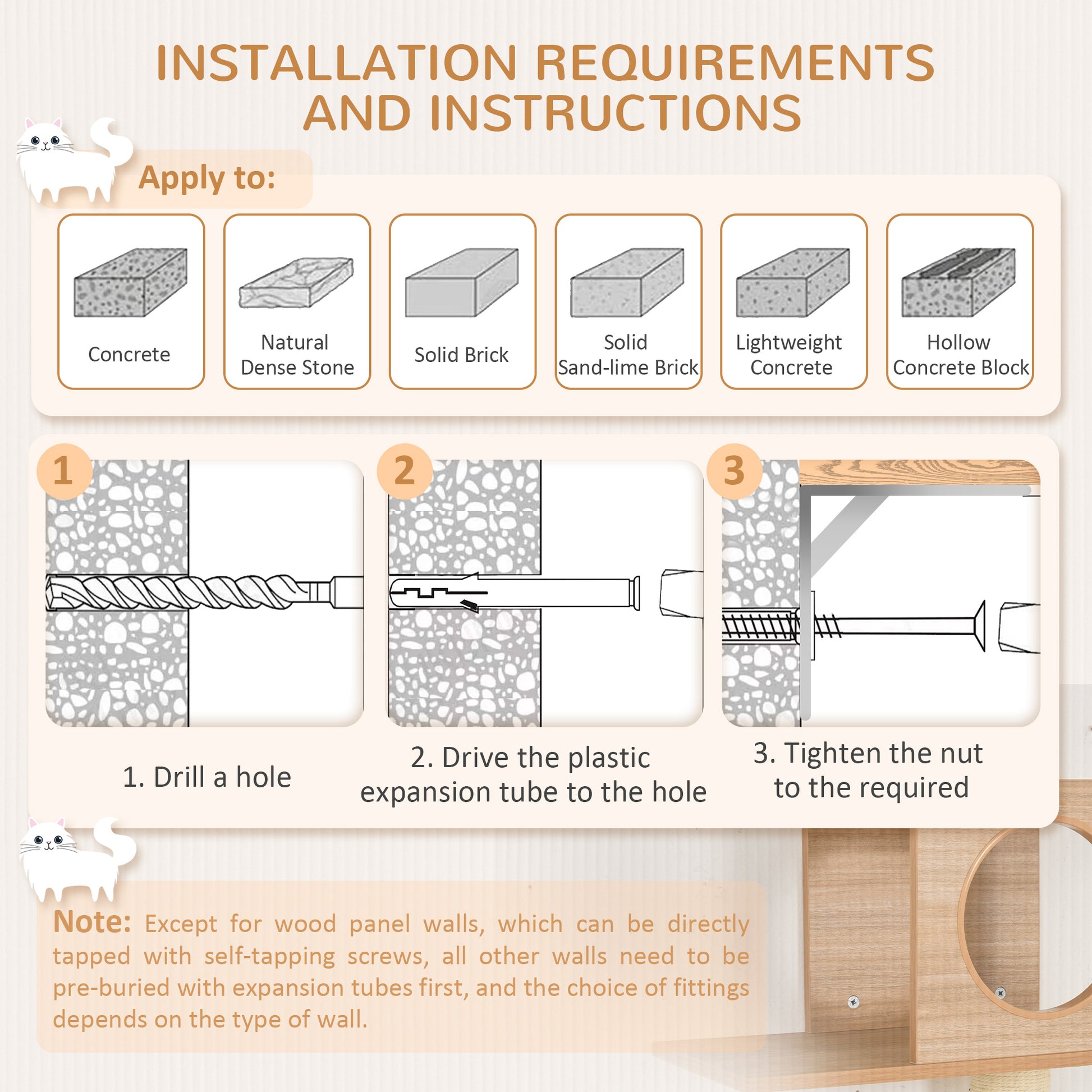 Keep your cats endlessly entertained with the PawHut cat tree! The cat scratchers of this cat activity tower benefit both pet and owners by providing someplace to relieve cats' desire to claw and to climb and saving your carpets and household furniture from damage. Plus, because the cat tower is wall-mounted, it saves plenty of space for smaller spaces. Rest, play, exercise, your cats can spend all day on it, a comfortable unit for your furry friends. Features: - Unique design features multiple platforms to give your frisky felines plenty of space to lounge and play - Cloth strip for ladder - Ladder with wooden slats, can be installed on the left or right side - Made of natural and environmentally friendly pine wood, more robust and durable - Encourages appropriate scratching and allows your cat to remove the dull nail sheath to reveal healthy paws - The diversified structure allows several cats to jump and rest on it at the same time - Easy to clean by damp cloth - Pine logging certificate and corresponding purchase contract - Easy assembly required Specification: - Color: Yellow - Material: Pine, Sisal - Short Cat Column Bottom Plate Size: 8.25" L x 7.75" W - Top Plate Size: 11.75" L x 14.75" W - Connection Ladder Size: 24.75" L x 9.75" W - Long Cat Column Bottom Platform Size:11.75" L x 11.75" W - Middle Platform Size: 15" L x 11.75" W - Top Platform Size: 19" L x 11" W - Upper Nest Size: 11.75" L x 11" W x 11.5" H - Round Cat Hole Size: Φ7.75" - Weight Capacity: 10 lbs - Net Weight: 23.1 lbs Package Includes: -1 x cat tree -1 x manual Transform your walls into a jungle gym for your cat. This wall-mounted cat activity set from PawHut features a feeding station, hammock stairs, scratcher post, and jumping platform to keep your felines busy. Your cat can play by themselves, make chase on the climbing set, or find their favorite spot to take a break. The wall-mounted design saves ground space for whatever you want, and cats sharpening their claws on the scratching post protects furniture. Provide your cats with lots of fun. Features: - 4-piece set with a feeding station, hammock stairs, scratching post, jumping platform - Wall-mounted design will satisfy their desire to climb - Scratching post keeps furniture protected - Made of multi-layer board, pinewood, and steel - Suitable for pets under 10 lbs. - Assembly required Specification: - Color: Beige - Material: Multi-layer Board, Sisal, Polyester, Pine, Acrylic, Steel - Feeding Station: 15" L x 13.5" W x 6" H (Overall), Φ 11.75" (Acrylic) - Polyester Hammock Size: 15.75" L x 10.25" W x 1.25" H - Cat Scratching Post Size: 7.75" L x 8.5" W x 18"H (Overall), Φ 2.75" (Post) - Jumping Platform Size: 39.25" L x 10" W x 7" H (Spreading Size) - Suitable for cats under: 10 lbs. - Weight Capacity: 22 lbs. (Each Piece) - Item Label: D30-461V80 Package Includes: - 1 x Cat Shelf Set - 1 x Instruction Manual.
