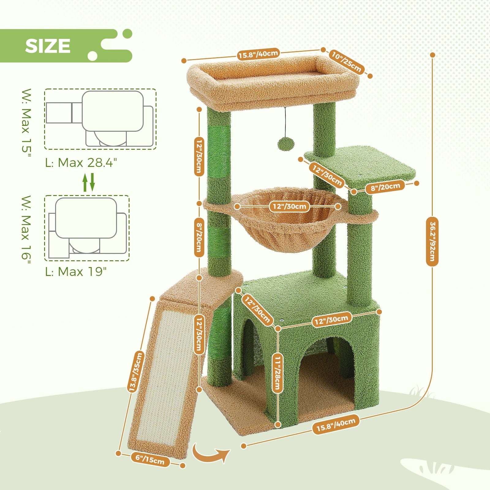 36'' Cute Cat Tree: This small but compact cat tree tower provides your indoor cats a resting and playing activity center. The kitten can lay on the top perch to overlook like a king, curl up in the cozy cat hammock or take a sweet nap in the private cat condo.