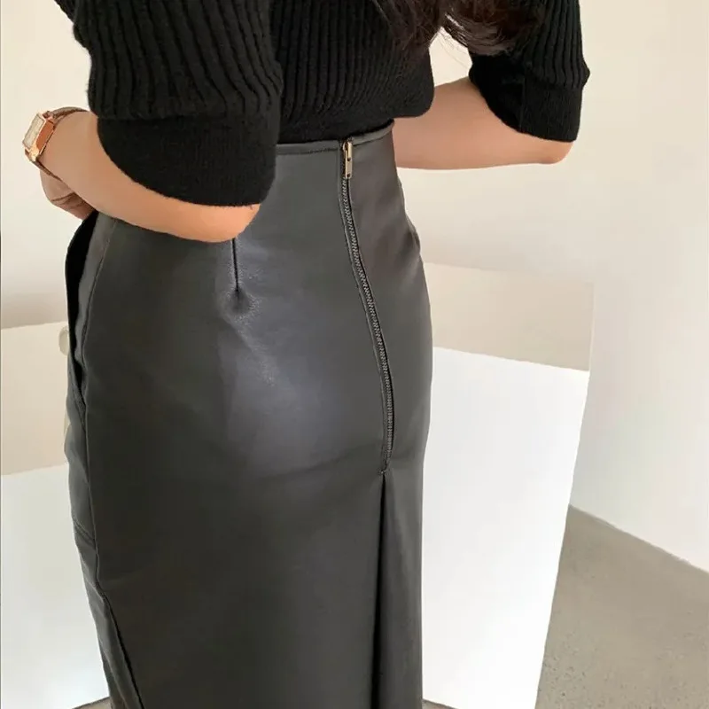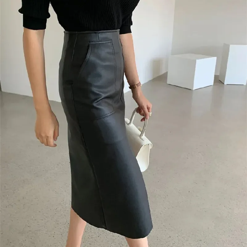 CM.YAYA Women High Waist PU Leather Vintage Straight Split Skirt 2025 Winter Street Pockets Basic Club Party Long Midi Skirts