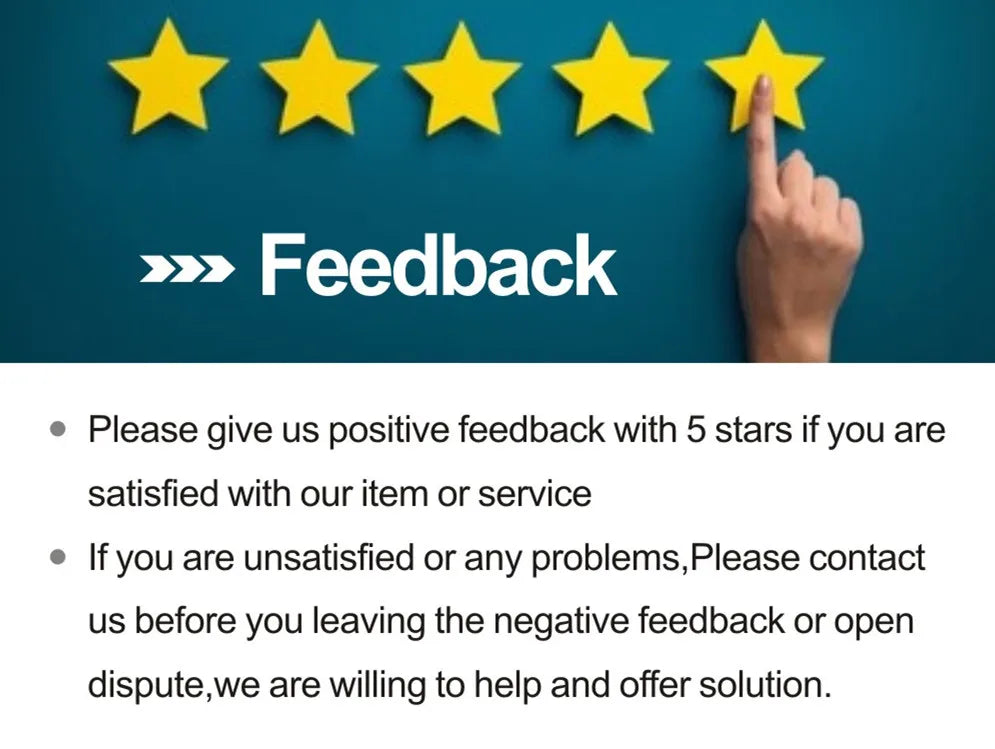 Your satisfaction is our pursuit. So if there is anything to make you unsatisfied,(including our product and service, or other thing).Please contact us to serve you again before you put the order to dispute, we will try our best to solve the problem for you.Your honest feedback is very important to us, thank you! thank you!