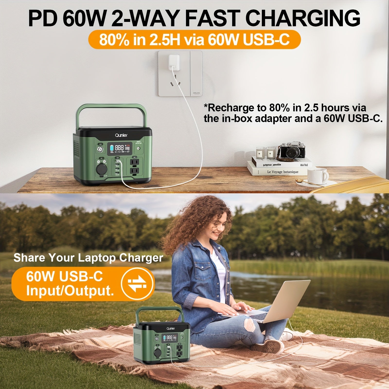 60W USB-C PD Input & Output (No extra adapter needed - Use one USB-C cable for charging & discharging)