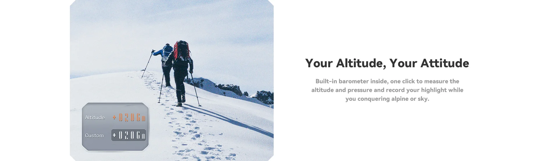 Built-in barometer inside, one click to measure the altitude and pressure and record your highlight while you conquering alpine or sky.