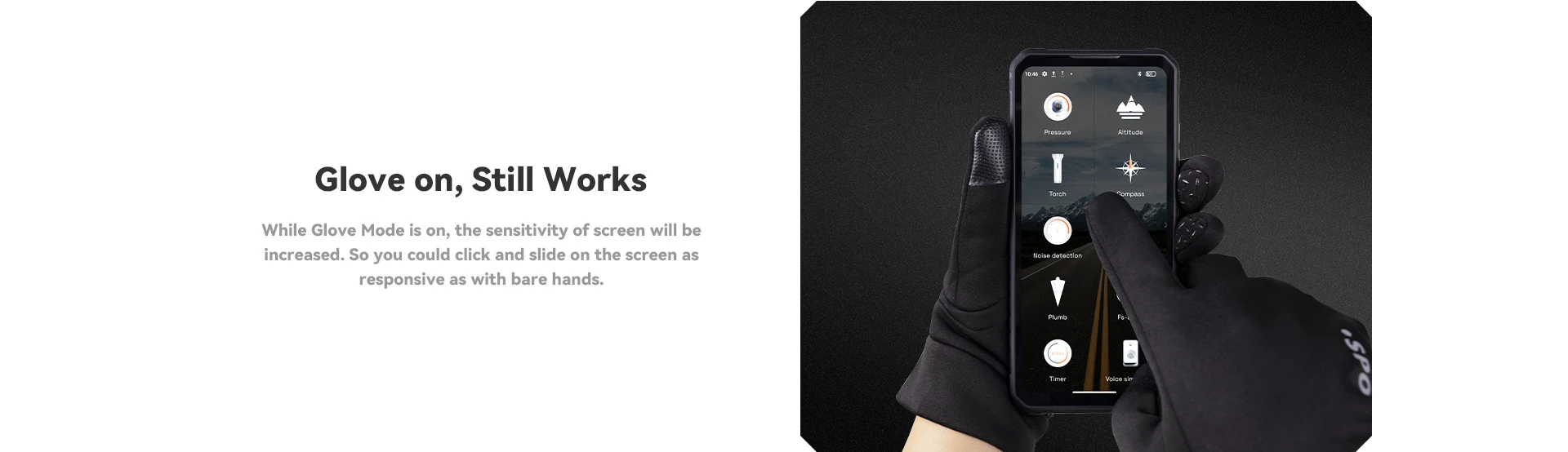 While Glove Mode is on, the sensitivity of screen will be increased. So you could click and slide on the screen as responsive as with bare hands.