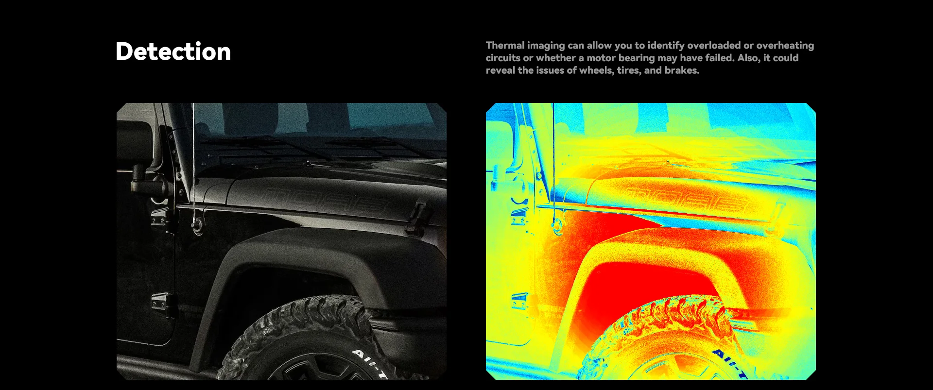 Thermal imaging can allow you to identify overloaded or overheating circuits or whether a motor bearing may have failed. Also, it could reveal the issues of wheels, tires, and brakes.