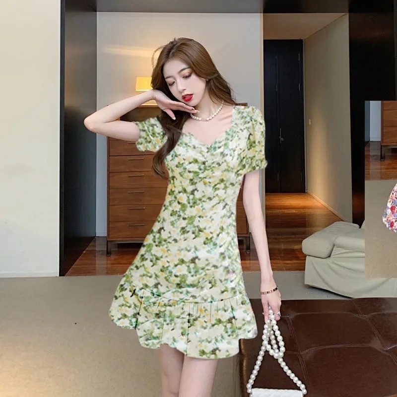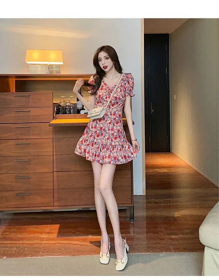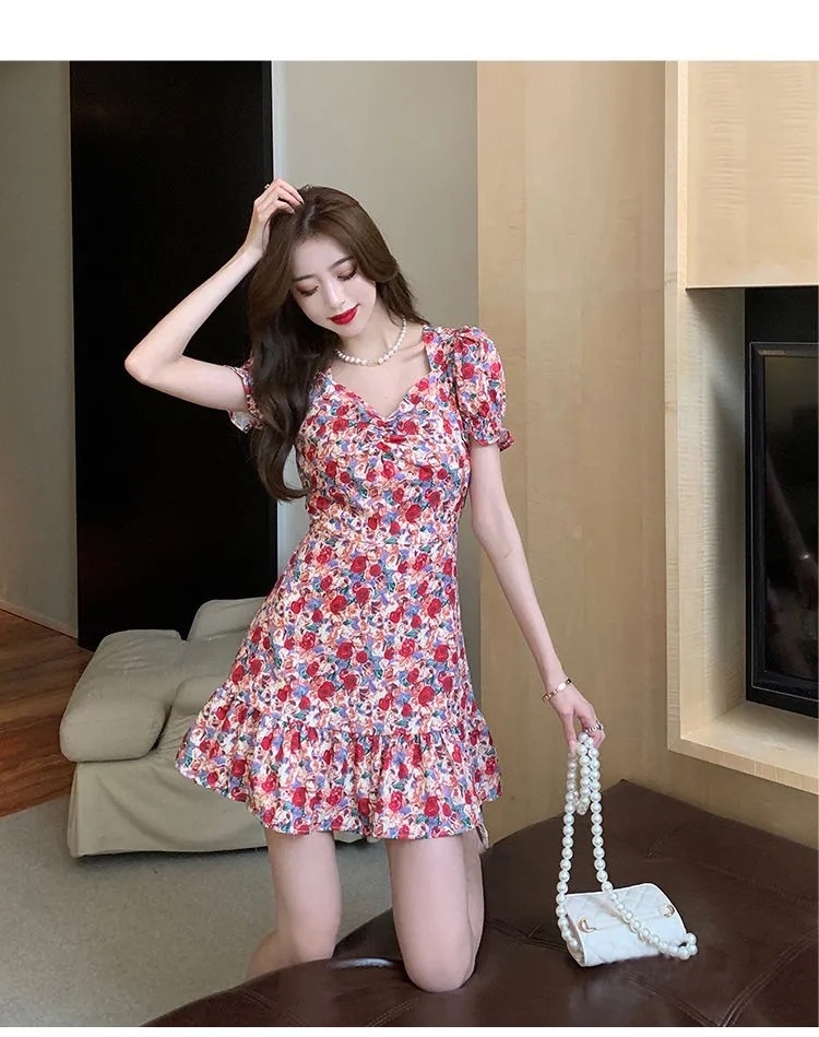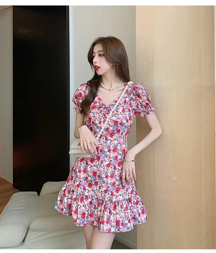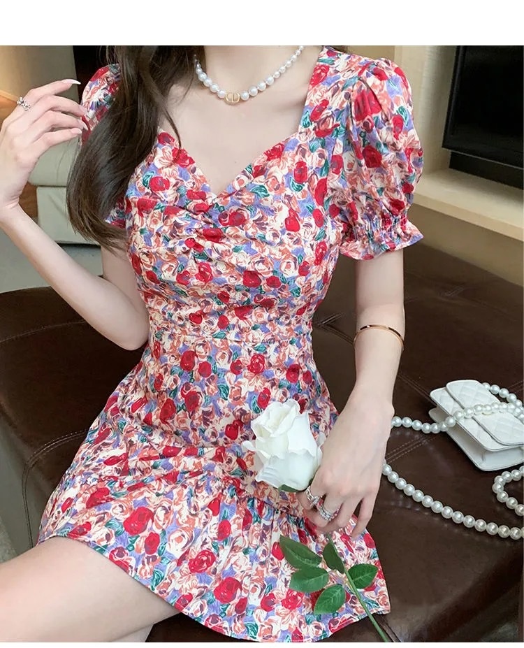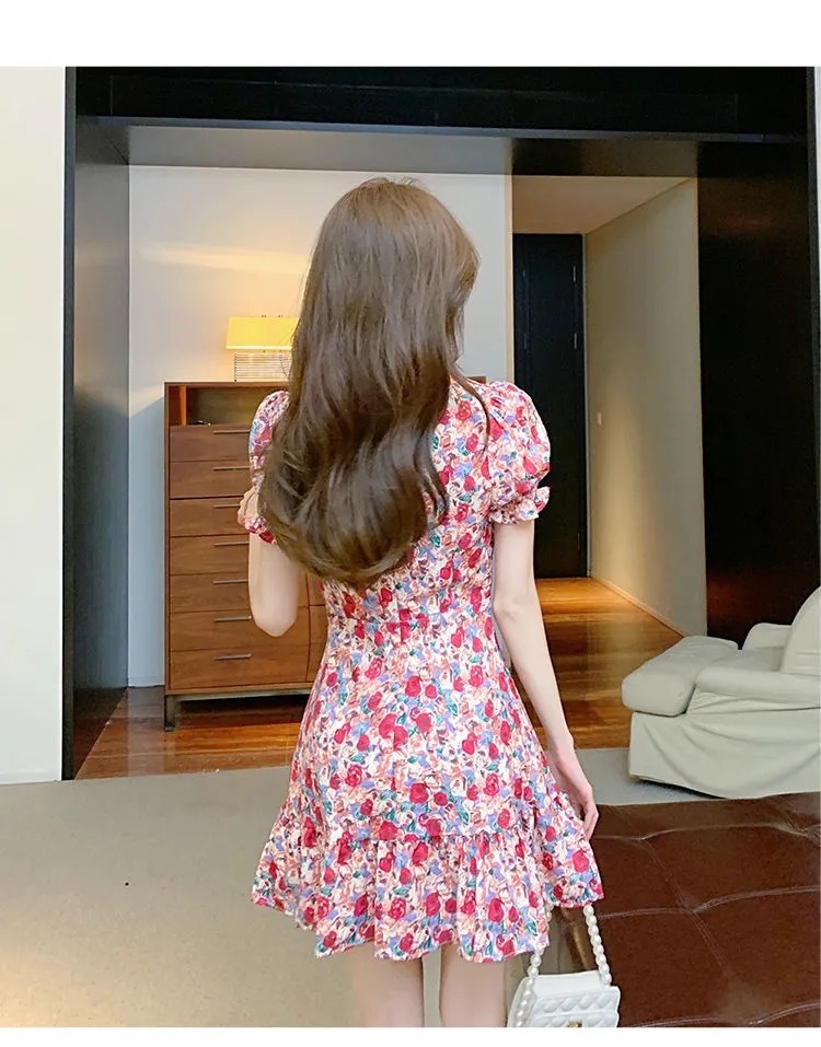 Plum Blossom Tea Break French Puff-Sleeve Floral Dress