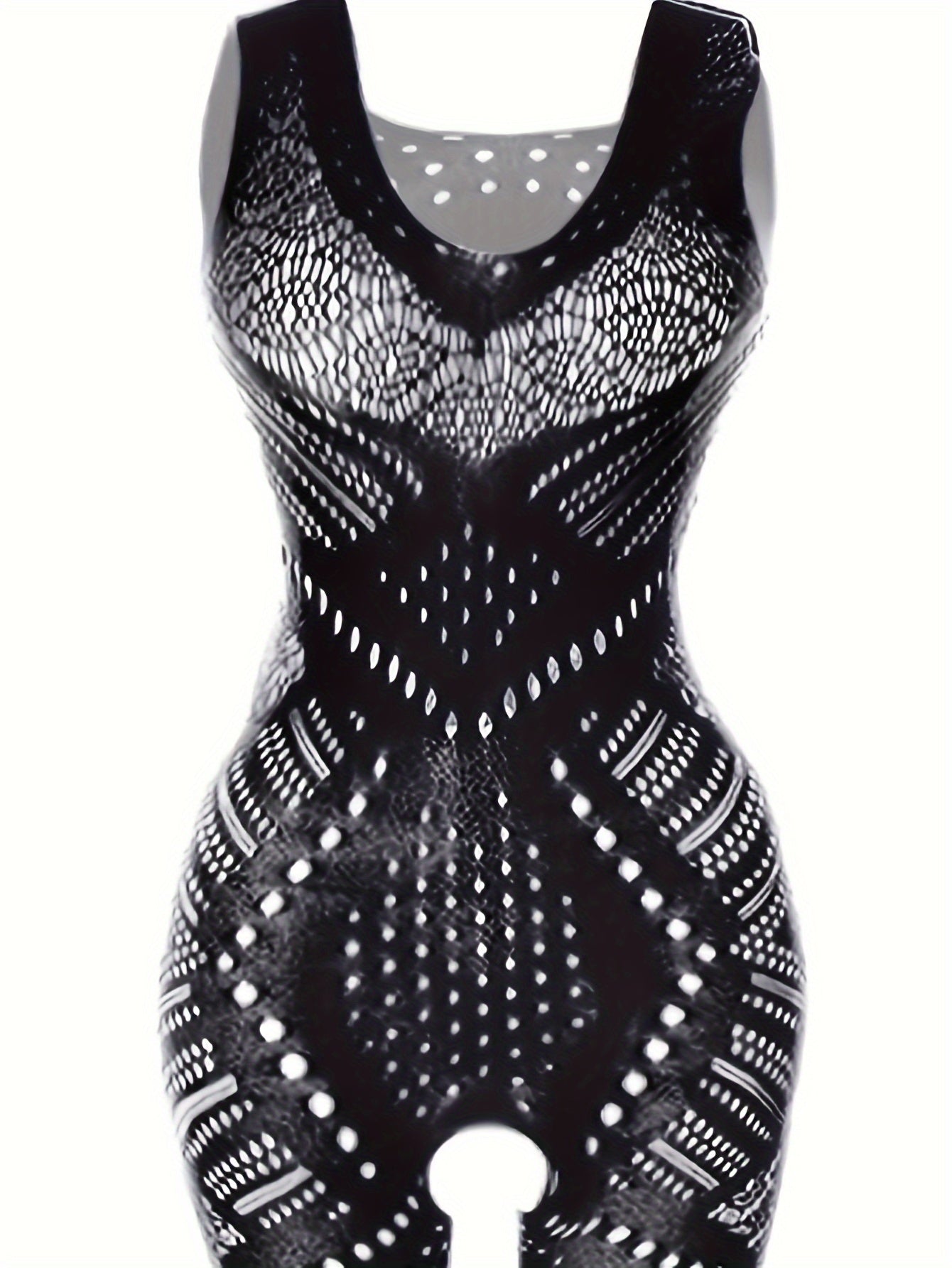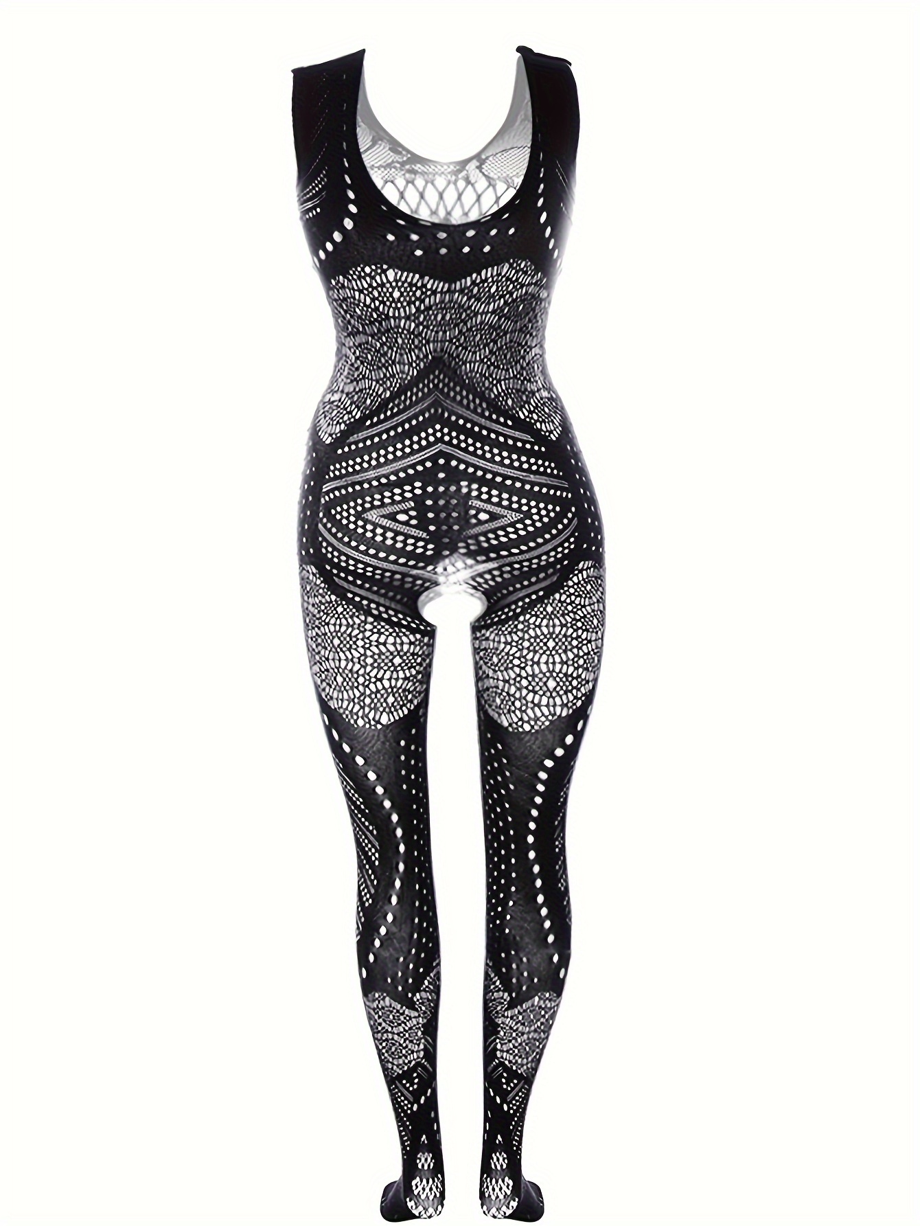 Plus Size Sexy Lingerie Bodysuit for Women - Black Hollow Out Sheer Fishnet, Stretchy Crotchless Full-Body Stocking, Intricate Geometric Patterns