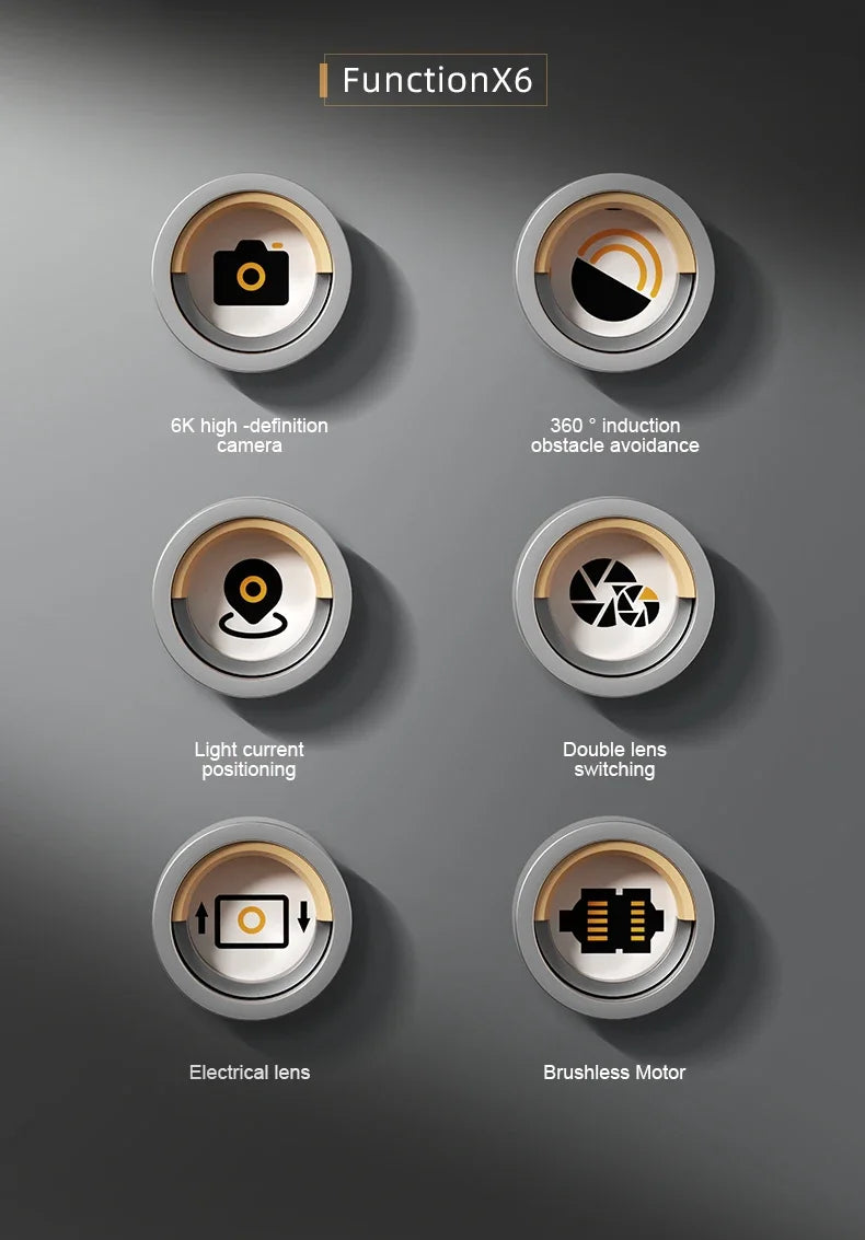 Features:1. The front lens is placed with wide-angle 6K high-definition WIFI, the bottom high-definition lens with optical flow can switch the camera angle, the servo pan tilt is designed to increase stability, and the EIS electronic anti shake is added to make the photo line clearer