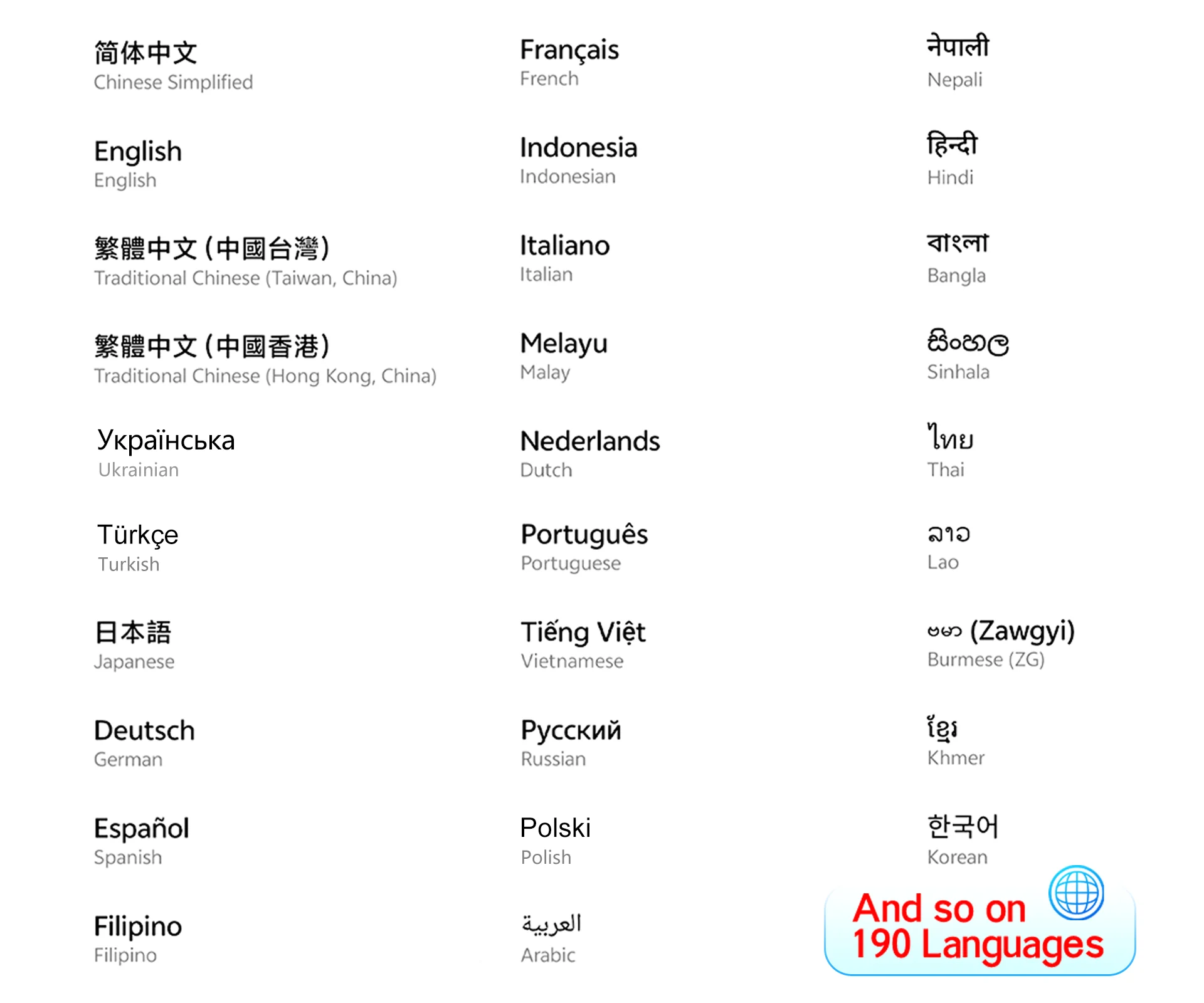 Bulgarian,Turkish,Vietnamese,Czech,Persian,Indonesian,Malay,Thai,Portuguese,Philippine,Hebrew,Cambodian,Khmer,Korean,Japanese