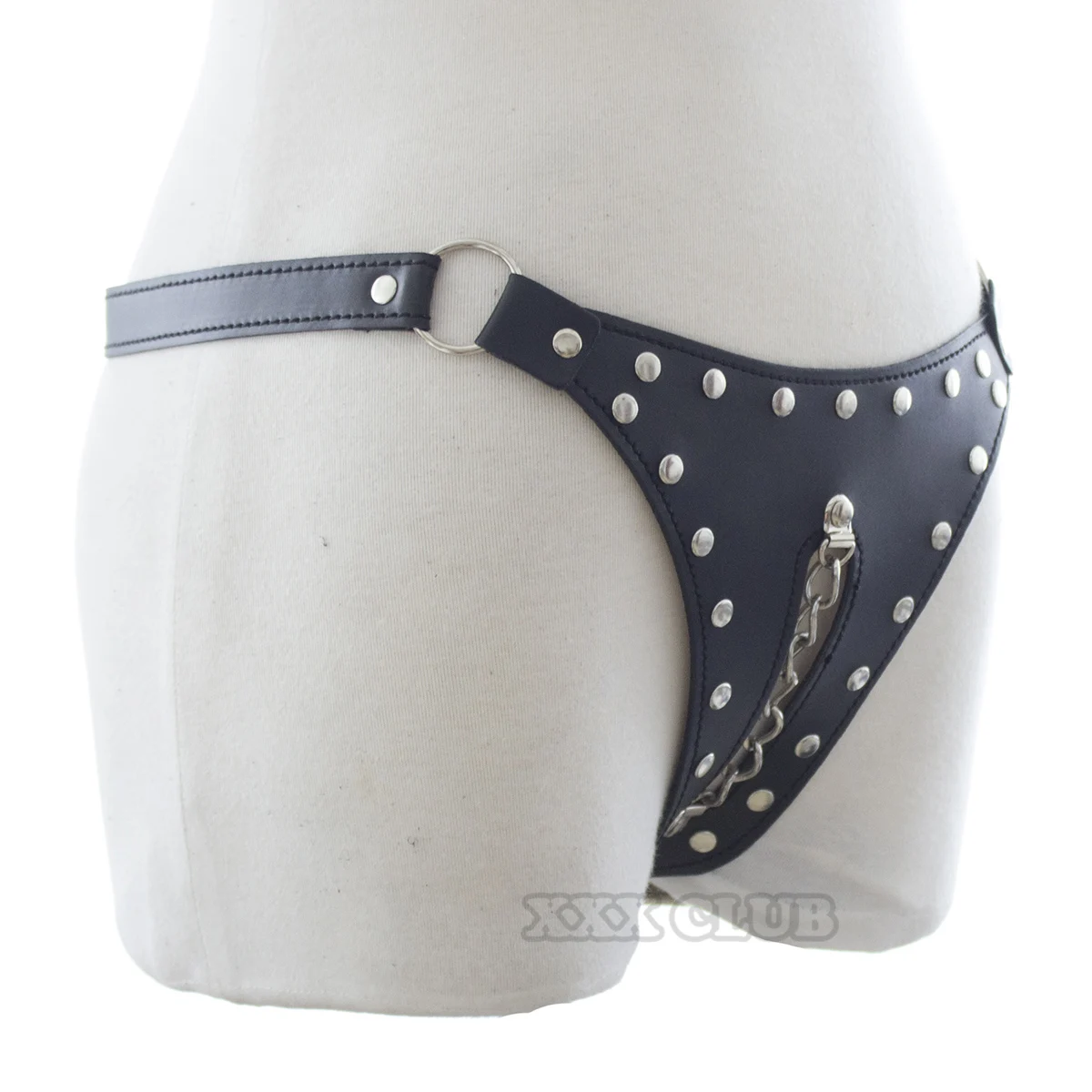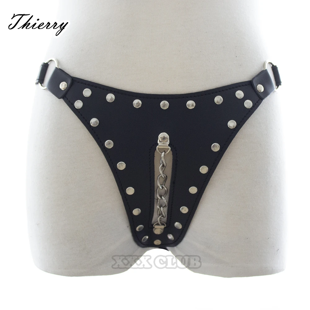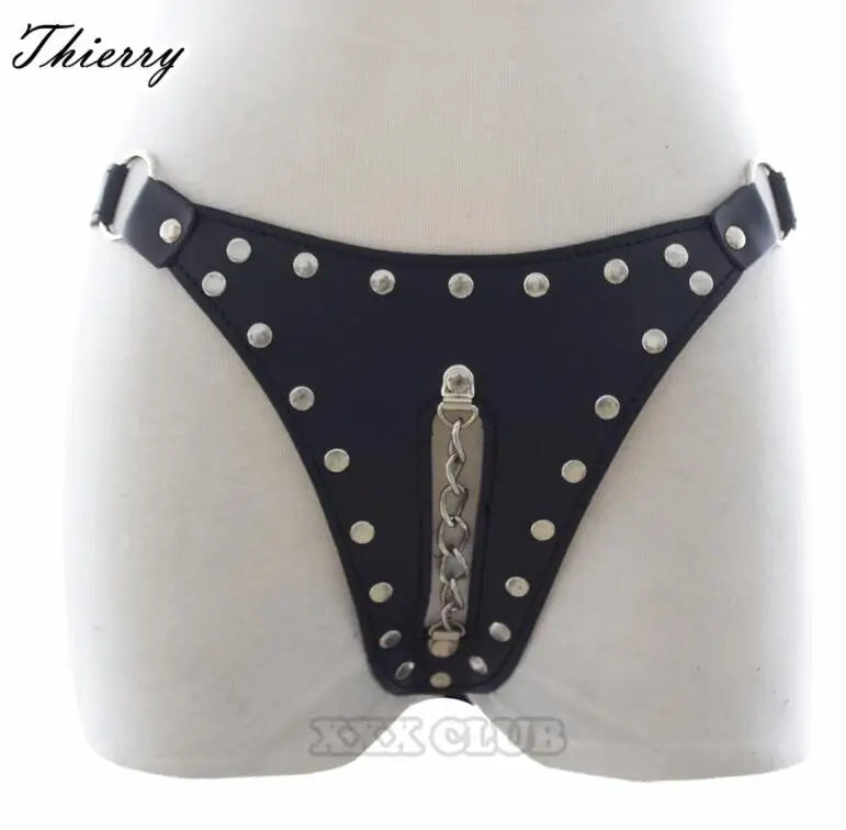 Thierry aAdult Games Female Sex Products Exotic PU Leather Black Thongs Sexy Chain Sexy Chain Adjustable Chastity Belt for Women