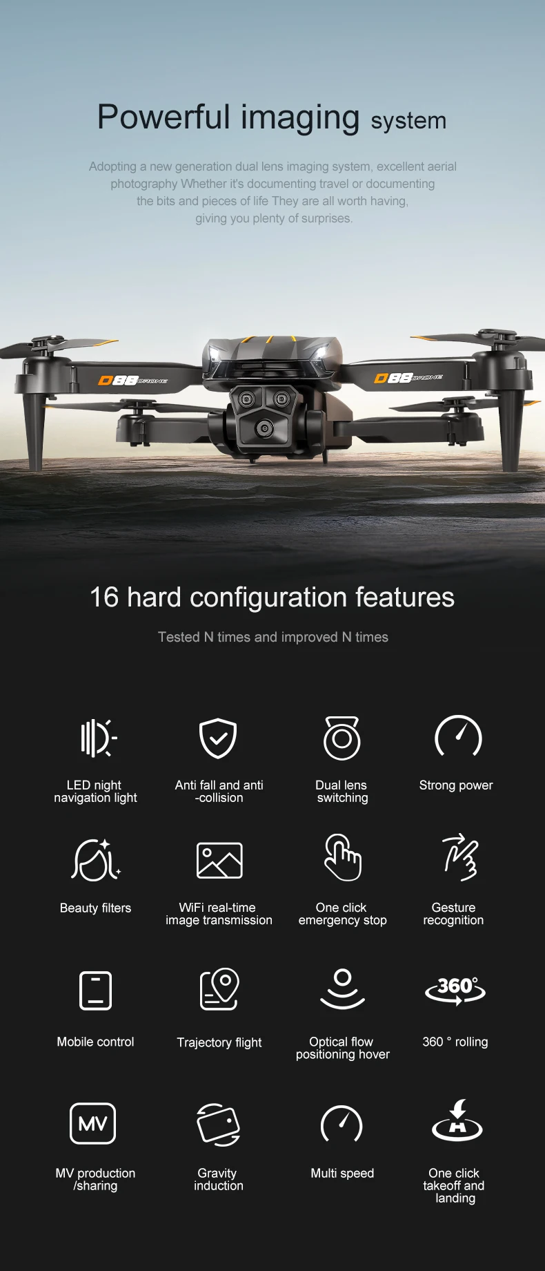Feature 2: The drone has a fixed altitude maintenance mode function, dual camera lenses, optical flow fixed-point positioning, and stable flight.