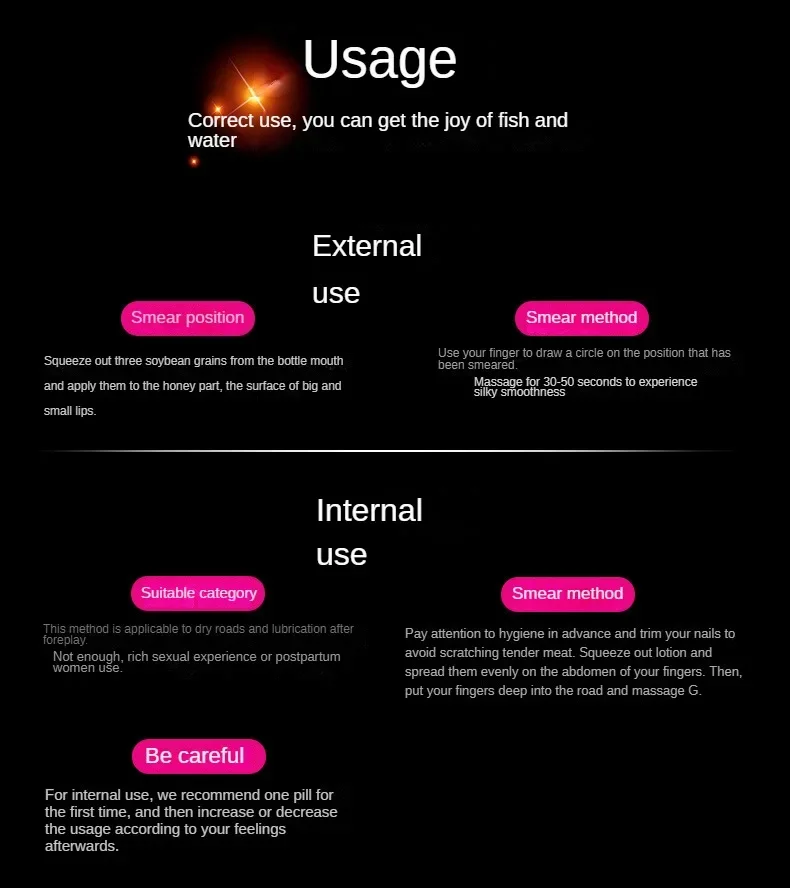 Usage: Spray 2-3 times and gently massage the labia and clitoris for 1 minute to begin sexual intercourse.