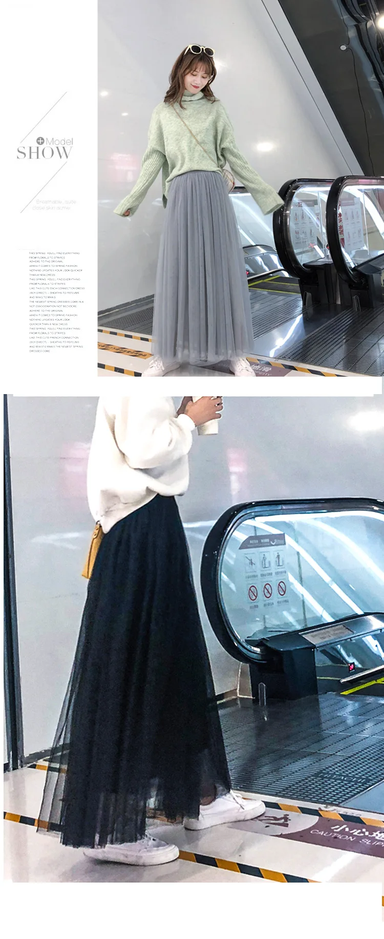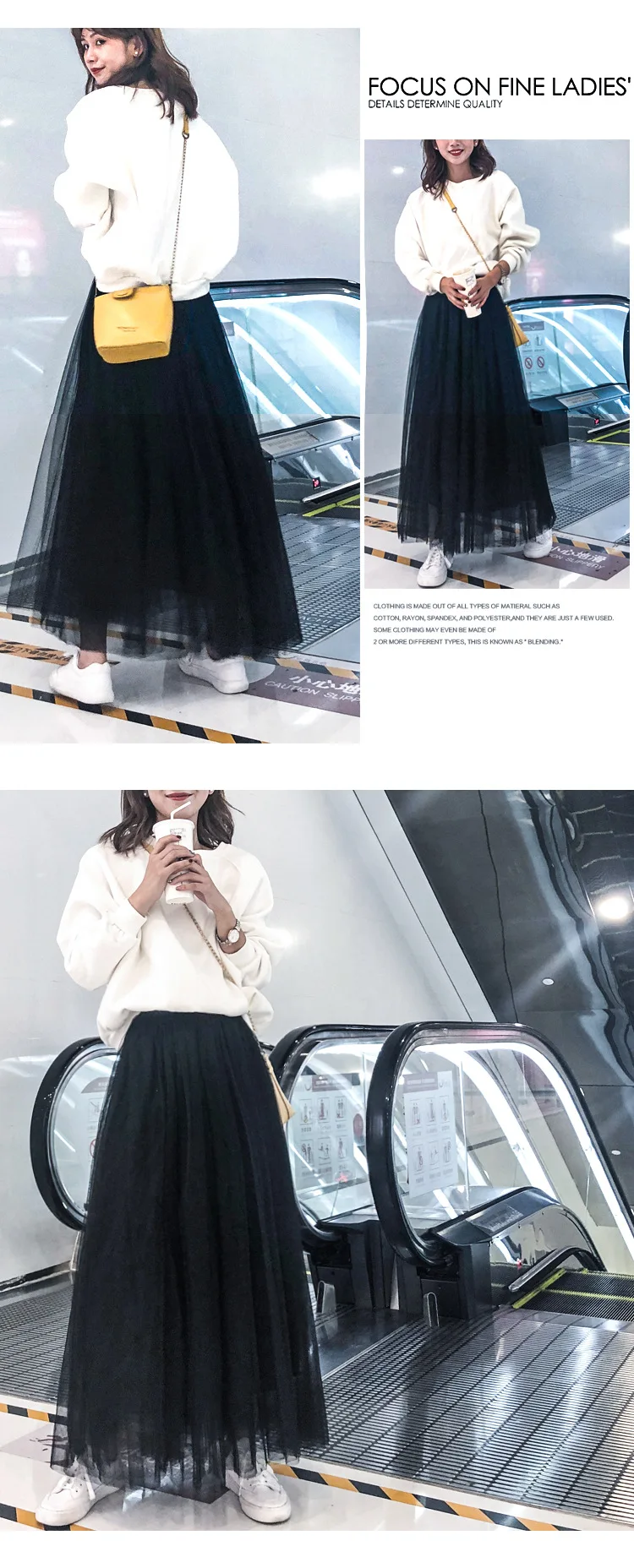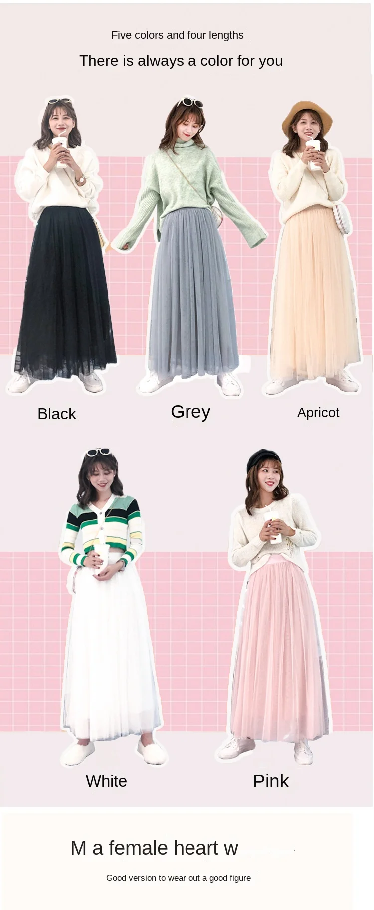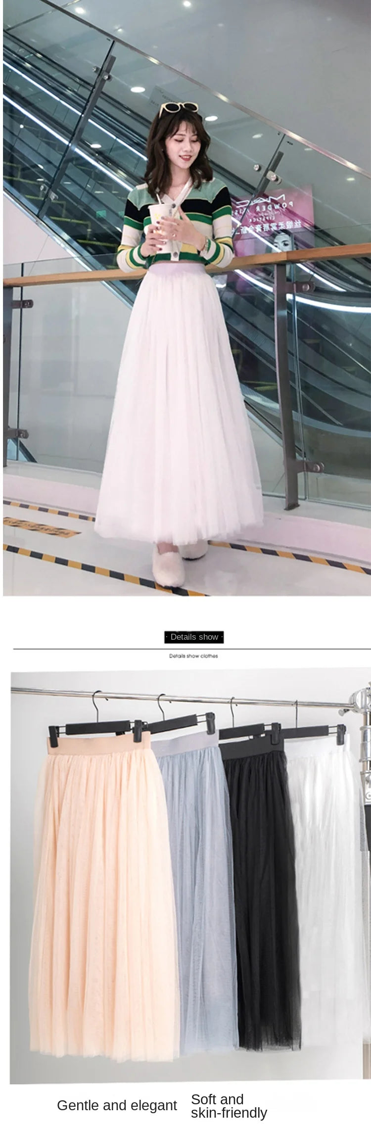 Women Mesh Elastic Tutu Skirt Beach Spring Summer Korean High Waist Fashion Pleated Long Skirt Black White Tulle Skirts LSK010