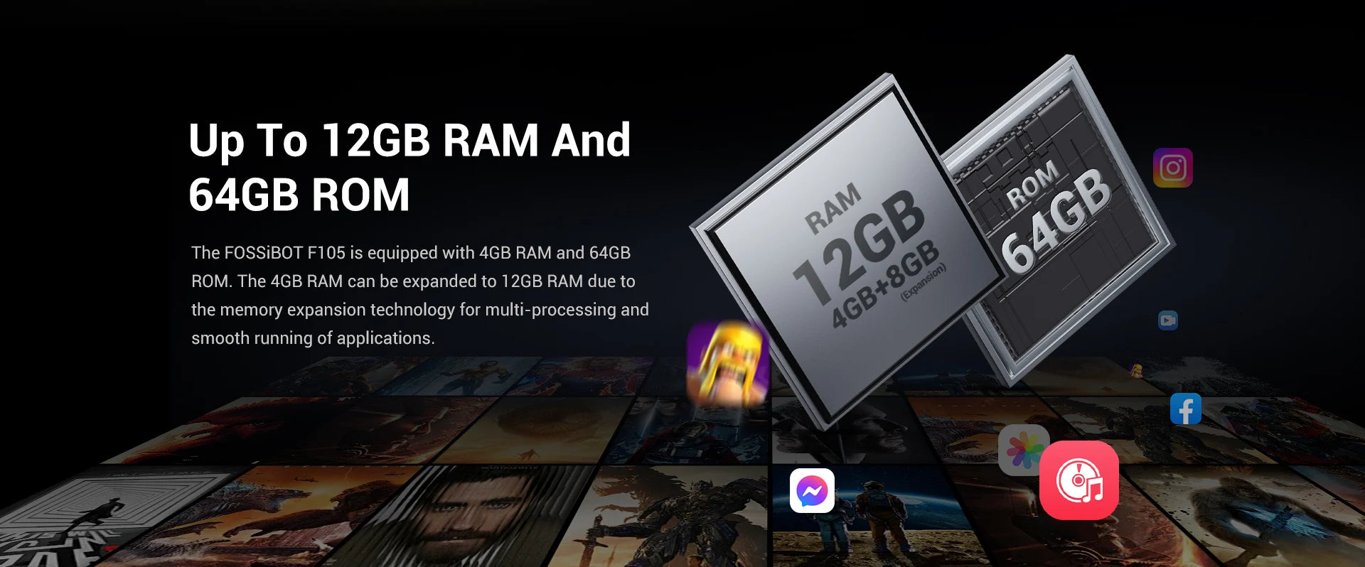 The FOSSiBOT F105 is equipped with 4GB RAM and 64GB ROM.The 4GB RAM can be expanded to 12GB RAM due to the memory expansion technology for multi-processing and smooth running of applications.