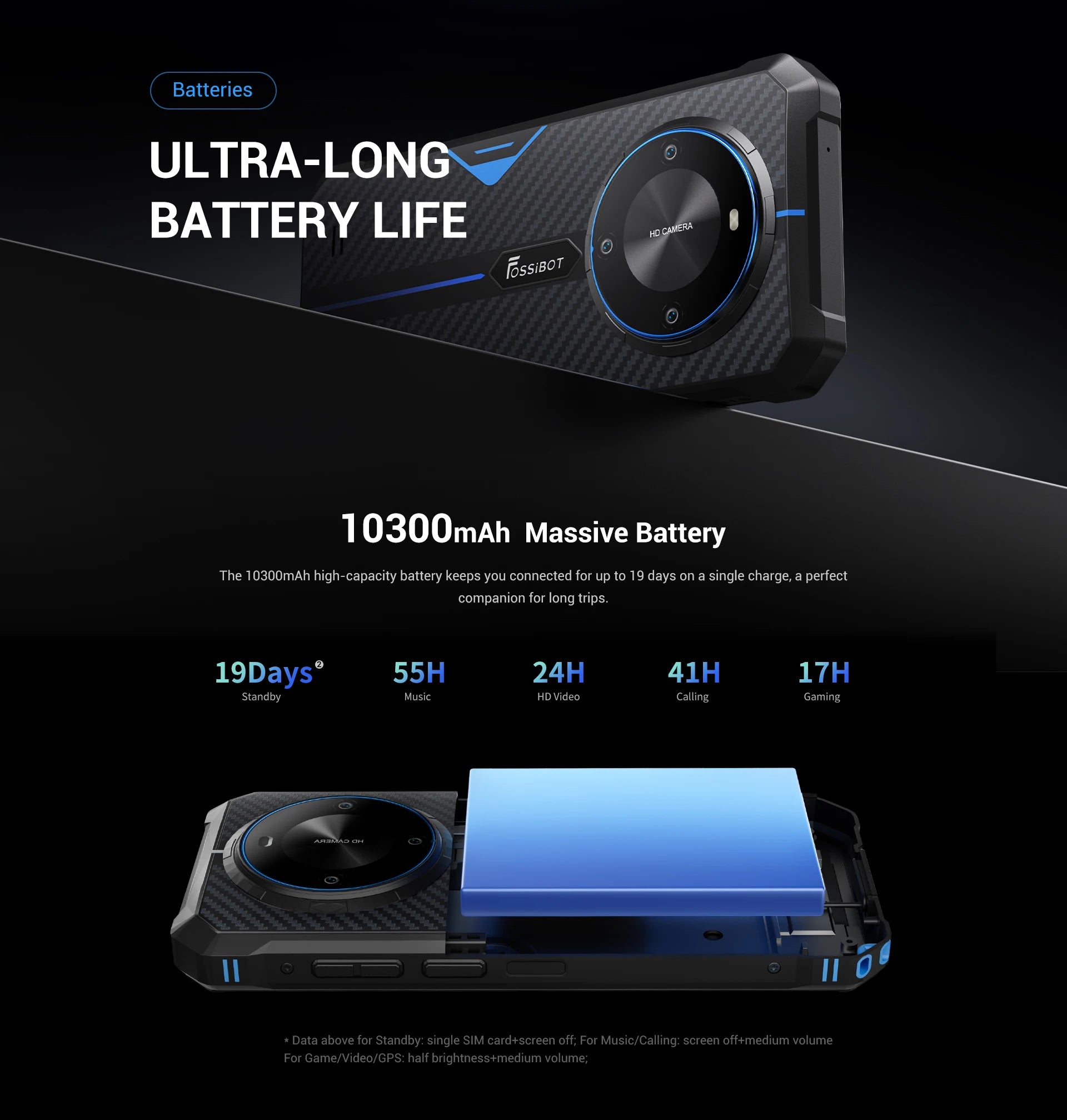 With this monster battery of 10300mAh,you are free to get up to 19 days of standby(with no sim)or 19 days standby with single sim inserted.