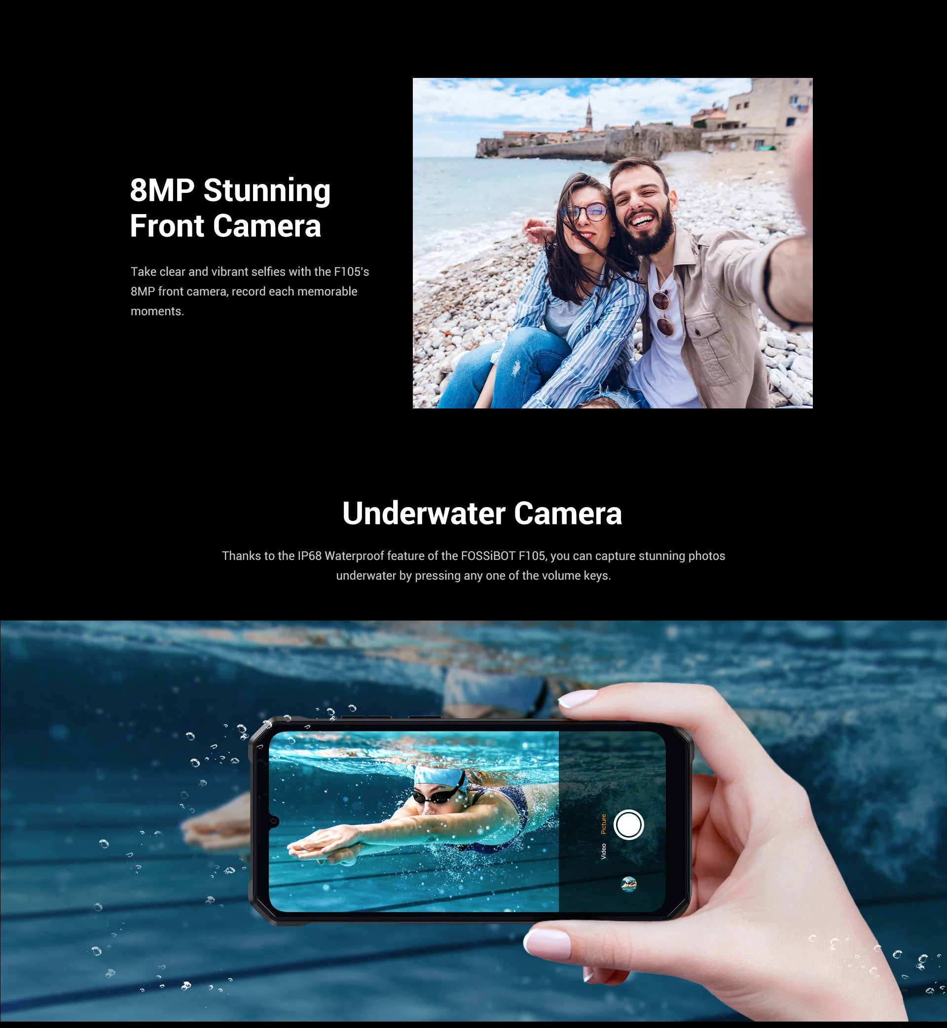 Thanks to the IP68 waterproof feature of the FOSSiBOT F105,you can capture stunning photos underwater by pressmg any one of the volume keys.