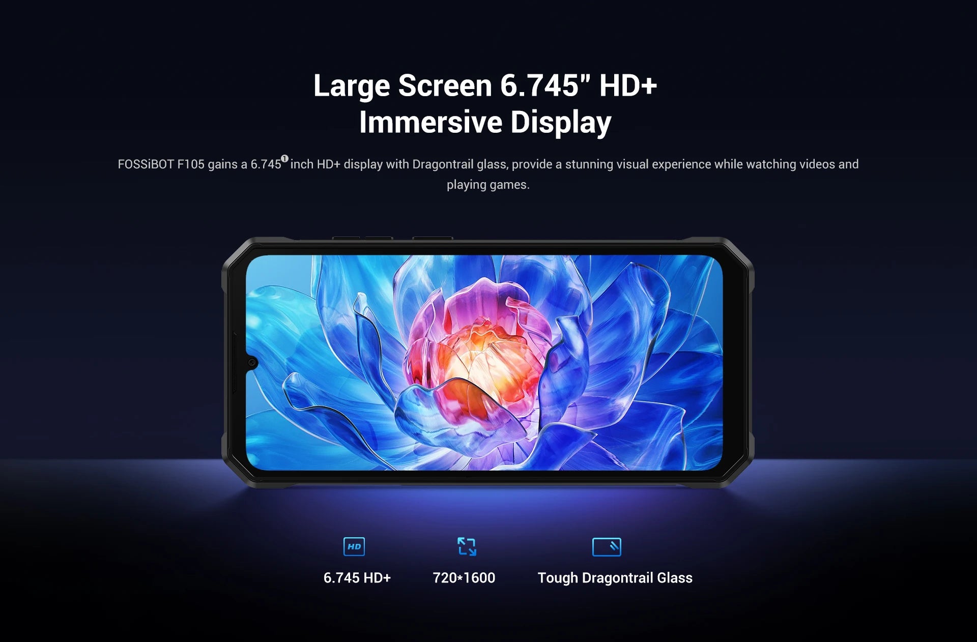 FOSSiBOT F105 gains a 6.745''inch HD+ display with Dragontrail glass, provide a stunning visual expenence while watching videos and playing games.