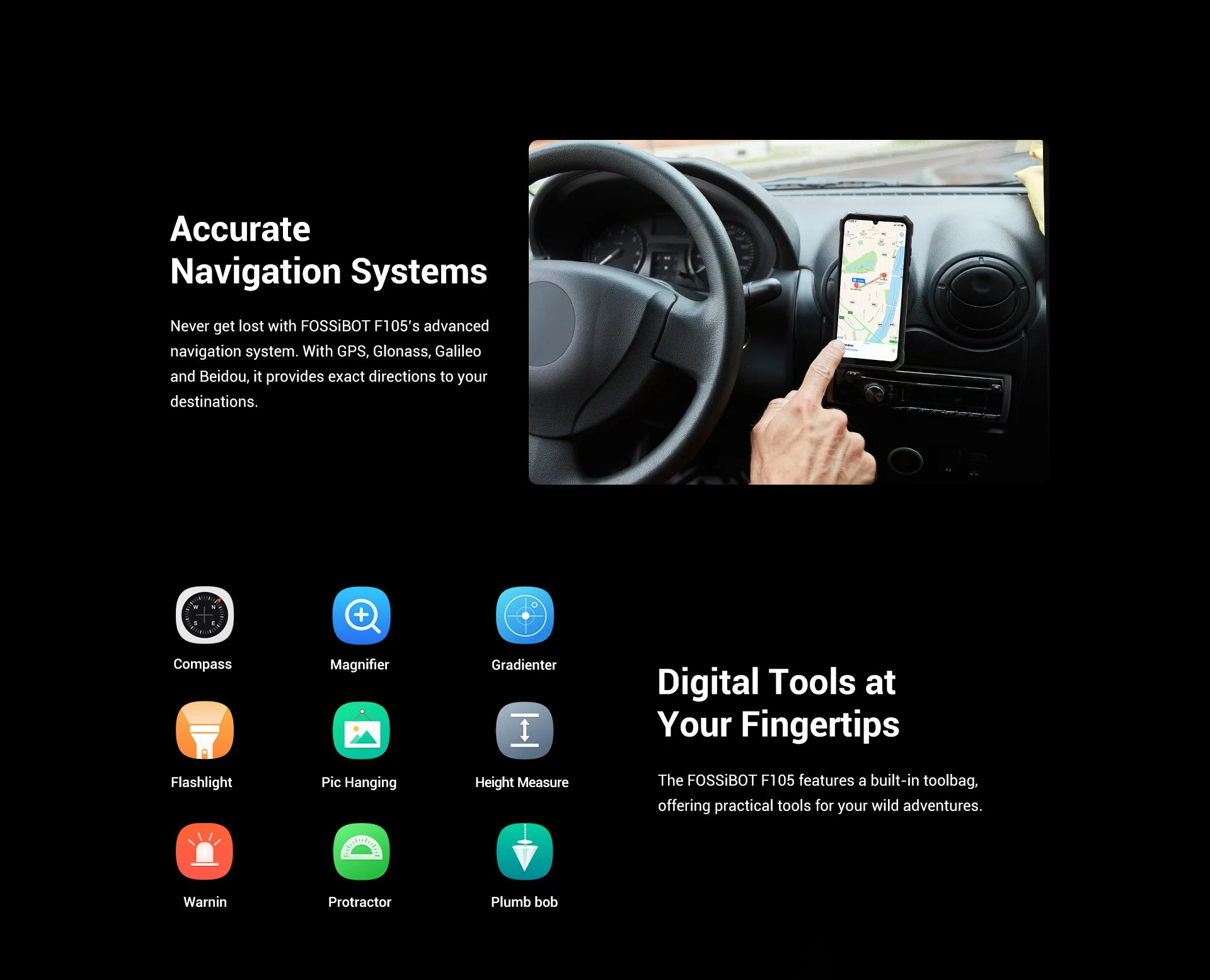 Never get lost with FOSSiBOT F105's advanced navigation system.With GPS,Glonass,Galileo and Beidou,it provides exact directions to your destinations.