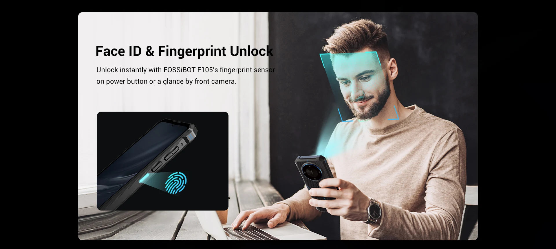 Unlock instantly with FOSSiBOT F105's fingerprint sensor on power button or a glance by front camera