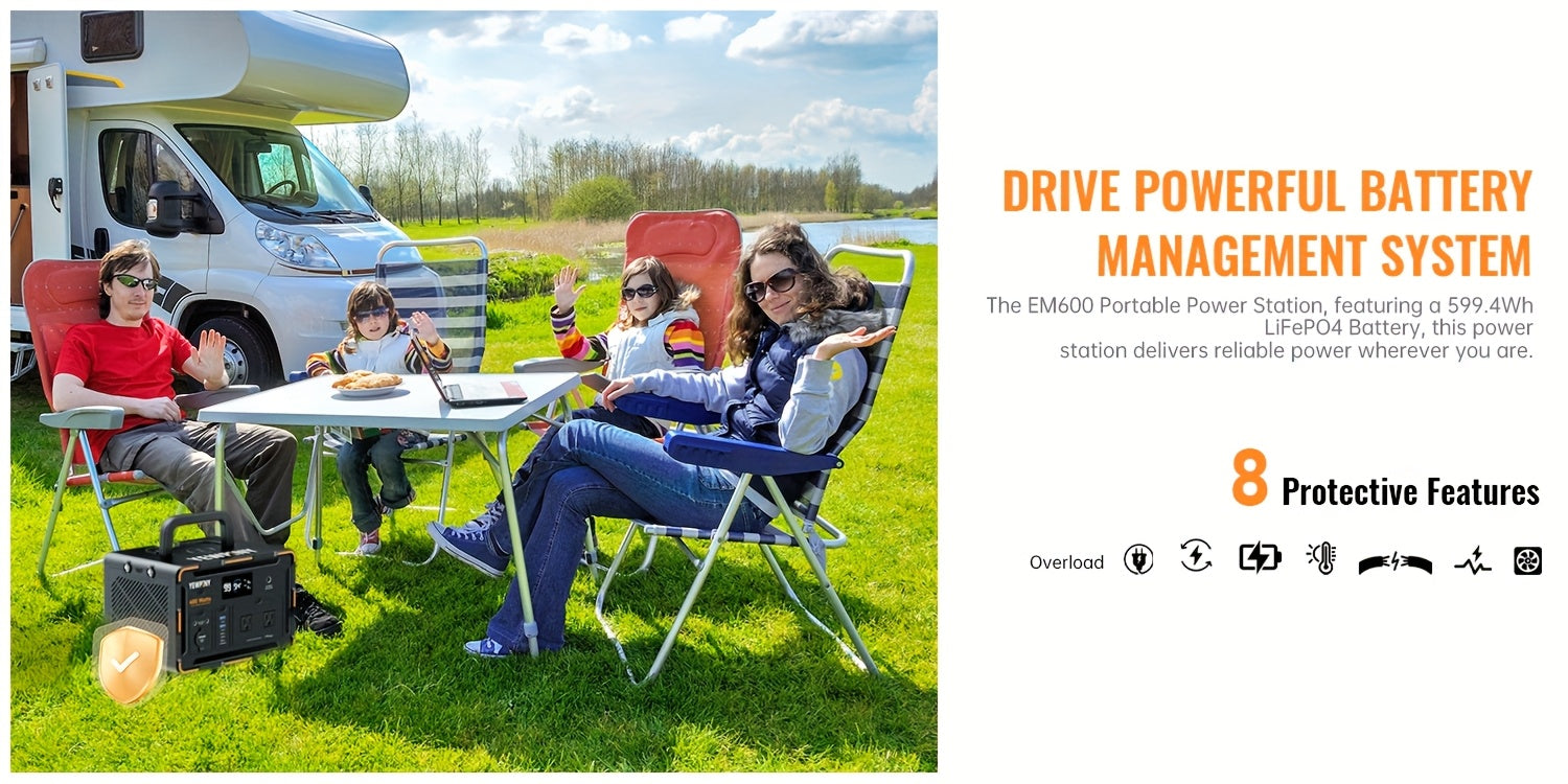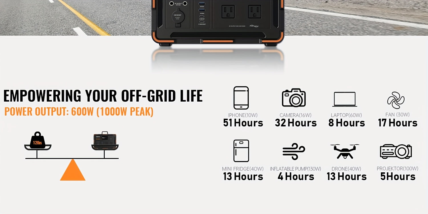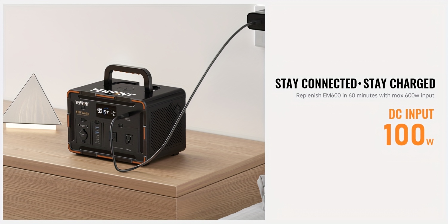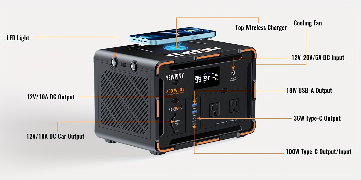 YEWPINY 600W Portable Power Station, 600W Fast Charging, 599.4Wh Lithium Battery Solar Generator AC Power Socket, DC Port, LED Lighting, PD And USB, A Total Of 9 Output Ports, Suitable for Home, Outdoor Travel, Camping And Po